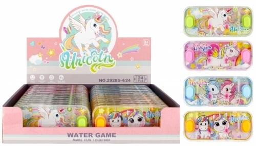 Zalety produktu: zadba o rozwój ruchowo-myślowy, występuje w czterech wzorach. Gra zręcznościowa polegająca na umieszczeniu wszystkich kolorowych obręczy na dwóch słupkach, posługując się jedynie dwoma przyciskami, które wprawiają obręcze w ruch dyktowany przez znajdującą się w środku wodę. Zawartość zestawu: gra wodna Jednorożec. Wymiary/waga/baterie: wymiary produktu (dł. x wys. x gł.) [cm]: 16x7x2, wymiary opakowania display A 24 (dł. x wys. x gł.) [cm]: 34x7x24, waga produktu bez opakowania [kg]: 0,13 kg, waga produktu w opakowaniu display [kg]: 3,23 kg, nie wymaga zasilania bateriami. Zabawka przeznaczona dla dzieci w wieku: 3+