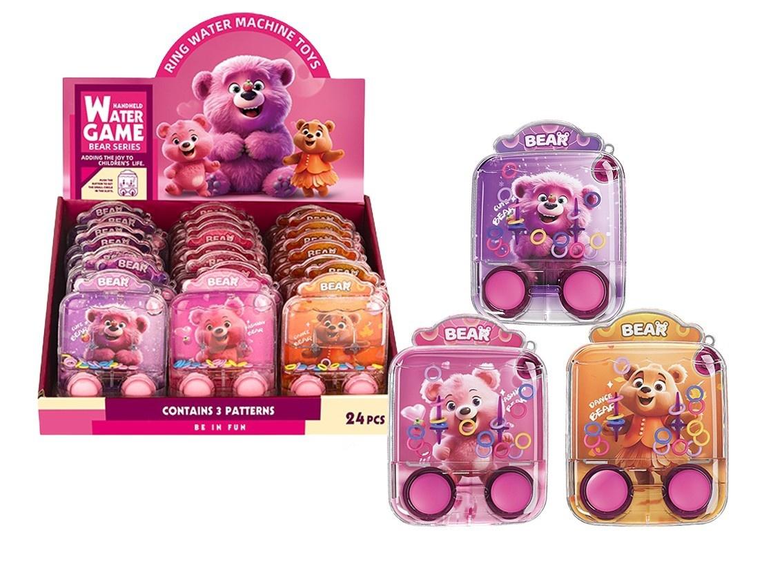 3 wzory; wym. zabawki: 7,5 x 10 x 2 cm; funkcje: naciśnięcie przycisków steruje strumieniem wody, celem gry jest trafienie wszystkimi pierścieniami na słupki; 3+