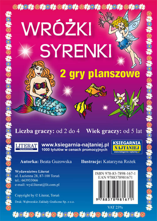 Zestaw dwóch gier planszowych: Wróżki i Syrenki – dla 2-4 graczy w wieku od 5 lat. Format planszy po rozłożeniu: 29,5 x 42 cm. W opakowaniu znajduje się kolorowa plansza dwustronna oraz instrukcja do obu gier z regułami gry. Zestaw nie zawiera pionków i kostki do gry.