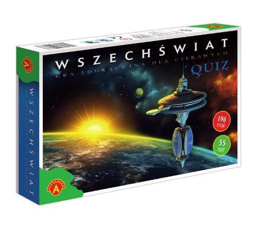 Quiz- WSZECHŚWIAT to gra edukacyjna dla 2-3 osób. Jej uczestnicy rywalizują ze sobą odpowiadając na pytania z kart pytań i odpowiedzi. Ich tematem jest historia, budowa i funkcjonowanie Wszechświata. W czasie emocjonujacej zabawy gracze wiele dowiadują się na ten niezwykle ciekawy, pełen nowych odkryć i zagadek temat. Zwycięzcą zostanie gracz, który udzieli najwięcej bezbłędnych odpowiedzi. Wiek: 10+ Zawartość pudełka: karty pytań i odpowiedzi - 49 sztuk karty liter "a", "b" - 3 x 2 sztuki plansza pionki do gry - 3 sztuki kostka do gry klepsydra notes
