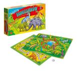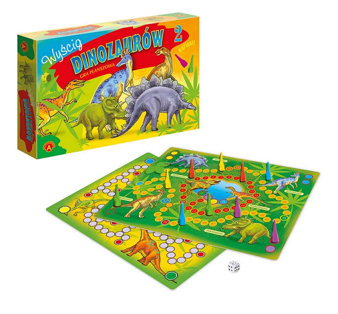 Uczestnicy tych gier utożsamiają się z dinozaurami, które chcą jak najszybciej zaspokoić swój głód i pragnienie. W pierwszym wariancie gry dinozaury starają się dotrzeć do wodopoju. Muszą jednak przejść przez niebezpieczną strefę, w której grasują dwa drapieżniki. W drugim wariancie zwycięzcą zostanie dinozaur, który mimo przeszkód i przeciwności zbierze najwięcej pokarmu. Wyścig dinozaurów to dwie emocjonujące gry dla całej rodziny. Zawartość pudełka: - 1 plansza - 2 strony - pionki - 10 szt. - żetony - 20 szt. - kostka do gry - instrukcja Liczba graczy: 2-4 Wiek graczy: 6+