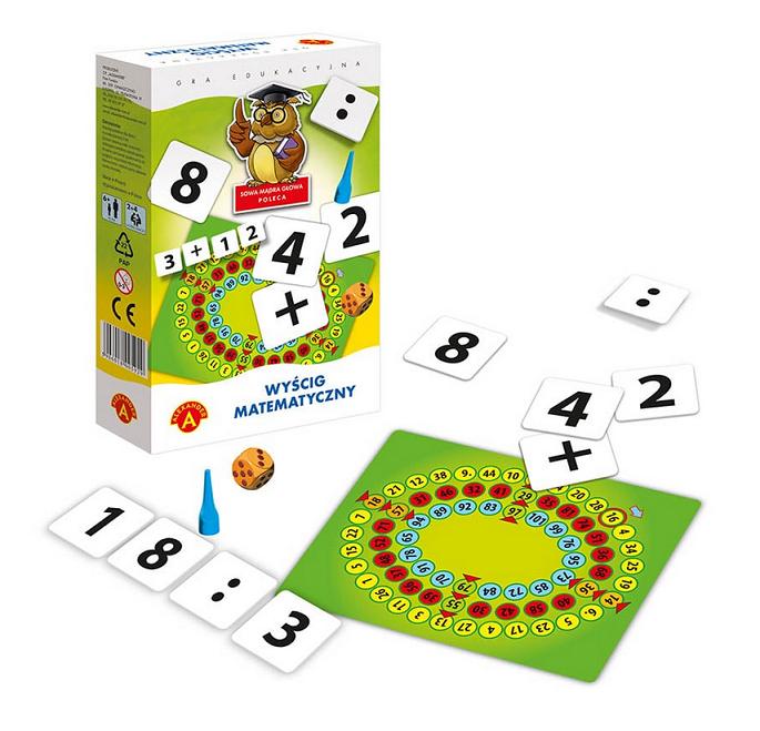 "Wyścig matematyczny" - emocjonująca gra i znakomity trening szybkiego liczenia. Z rozłożonych na stole liczb i znaków matematycznych należy ułożyć jak najszybicej działanie, którego wynik będzie zgodny z liczbą pola planszy, na któej stanie pionek. Gra zapewnia dobrązabawę, uczy szybkiego liczenia i spostrzegawczości. Zawartość pudełka: - tabliczki z z liczbami i znakami - 64 szt. - pionek - 1 szt. - plansza - kostka - instrukcja Wiek graczy: 7+ Liczba graczy: 2-4