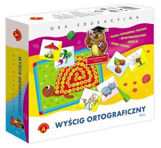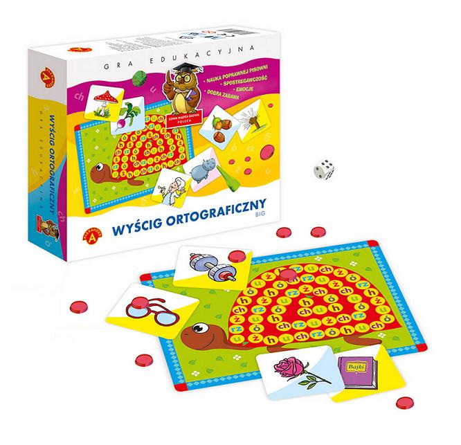 W grze "Wyścig ortograficzny" wygrywa ten, kto najszybciej odnajdzie, wśród tabliczek leżących na stole, obrazek zawierający w nazwie literę z pola, na którym zatrzymał się pionek. W trakcie zabawy dzieci poznają i utrwalają sobie właściwą pisownię wyrazów z "rz", "ż", "ch", "h", "ó" i "u". Gra jest również świetnym treningiem spostrzegawczości i refleksu dla młodszych i starszych graczy. Zawartość pudełka: - tabliczki z obrazkami - 96 szt. - pionek - 1 szt. - plansza - kostka - żetony - 60 szt. - instrukcja Wiek graczy: 7+ Liczba graczy: 2-5