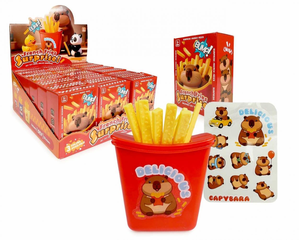 15 szt/disp; 3 wzory; wym. zabawki: 8 x 10 x 3 cm; funkcje: gra polega na naprzemiennym wyciąganiu frytek z pudełka w taki sposób, aby nie trafić na tę jedną, która zwolni sprężynę i wyrzuci całą zawartość w powietrze; osoba, która trafi na fałszywą frytkę, przegrywa grę; wym. opak.: 10 x 13 x 5 cm; wym. disp.: 30,7 x 36,2 x 31,2 cm; 3+