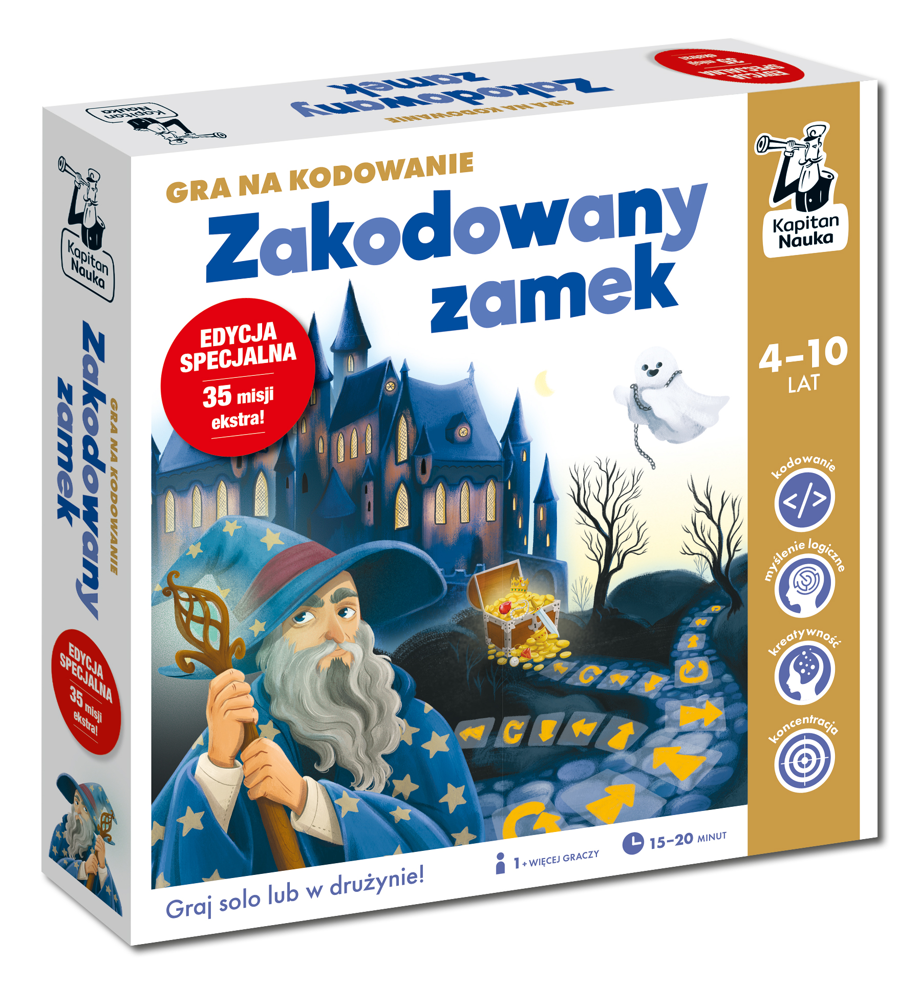 Poznaj tajniki podstaw programowania! Gra na kodowanie Zakodowany zamek. Edycja specjalna to wyjątkowe wydanie bestsellerowej gry dla całej rodziny. Wydanie rozszerzone zawiera 35 dodatkowych dużych kart, na których znajdziemy misje do realizacji solo albo w drużynie. Misje podzielone są na różne stopnie trudności, do każdej z nich przygotowane jest rozwiązanie z wyjaśnieniem graficznym krok po kroku. Atrakcyjnym dodatkiem jest drewniany pionek przedstawiający czarodzieja, a całość mieści się w eleganckim, solidnym pudełku. Gra kooperacyjna Zakodowany zamek. Edycja specjalna wprowadza dzieci w podstawy programowania bez użycia komputera. Dzięki układaniu odpowiednich sekwencji kart, które prowadzą czarodzieja do poszukiwanych skarbów, dzieci uczą się tworzenia zrozumiałych komunikatów oraz algorytmów, czyli powtarzalnych sekwencji. Rozwijają w ten sposób myślenie logiczne, kreatywność oraz koncentrację na zadaniu. Podczas gry doskonalą również kompetencje społeczne i zdolność współpracy, by osiągnąć wspólny cel, czyli opracować strategię zebrania trofeów, zanim zrobi to duch. Gra Zakodowany zamek to nasz bestseller – sprzedaliśmy już ponad 30 000 egzemplarzy tej gry w wersji standard! W edycji specjalnej: 35 dodatkowych kart z angażującymi misjami do realizacji w pojedynkę lub w grupie drewniany pionek czarodzieja i opakowanie premium niepowtarzalna możliwość wyboru emocjonującej rozgrywki kooperacyjnej w grupie albo wciągającej zabawy w pojedynkę Gra Zakodowany zamek wykorzystuje STEM (ang. Science, Technology, Engineering, Maths), czyli nowe podejście do uczenia się, integrujące nauki ścisłe, nowoczesne technologie, inżynierię oraz matematykę w celu rozwijania umiejętności myślenia logicznego, rozwiązywania problemów, kreatywności oraz współpracy. Zamiast strategii opartych na pamięciowym przyswajaniu informacji gracze zdobywająnowe umiejętności dzięki wykorzystaniu: pomysłowości efektywnego myślenia potrzeby eksperymentowania Doskonalą przy tym zdolności niezbędne zawodowym programistom, m.in. koncentrację, kreatywność, wytrwałość i cierpliwość w poszukiwania rozwiązań. Barwne ilustracje Justyny Hołubowskiej-Chrząszczak przyciągają uwagę magicznym klimatem, oddając atmosferę tajemniczego zamku i zachęcając do zabawy w kodowanie. Okiem Eksperta Oryginalna gra kooperacyjna o interesującej fabule i intrygującej szacie graficznej, wprowadzająca w podstawy programowania oraz tworzenia algorytmów. Podczas nabywania umiejętności kodowania gracze współpracują ze sobą, doskonaląc kompetencje społeczne i cyfrowe – kluczowe w nowym społeczeństwie informacyjnym. Wartościowa pomoc dydaktyczna dla nauczycieli edukacji początkowej oraz emocjonująca gra rodzinna o walorach integrujących. dr Aleksandra Szyller, nauczyciel edukacji wczesnoszkolnej, wykładowca akademicki na Wydziale Pedagogicznym UW, prowadząca szkolenia dla nauczycieli, właścicielka firmy szkoleniowej www.mamtemoc.edu.pl Plansza, żetony, karty oraz pionek zostały wykonane z dobrej jakości materiałów, co gwarantuje bezpieczną zabawę oraz wytrzymałość nawet podczas najbardziej emocjonujących rozgrywek. Kapitan Nauka to marka, która powstała dzięki rodzicom poszukującym mądrej, pełnej radości, ale i wymagającej rozrywki dla dzieci. Skupiamy się na zagadkach, grach, puzzlach i książeczkach, które uczą przez kreatywną zabawę i wspomagają rozwój dziecka. Produkty Kapitana Nauki dostosowane są do potrzeb dzieci od narodzin do 11. roku życia. Stymulują rozwój kluczowych umiejętności, takich jak koncentracja, pamięć, spostrzegawczość, myślenie logiczne, kreatywność. Są świetną alternatywą dla smartfona czy komputera, a czas spędzony przy wspólnych rozgrywkach, w gronie rodziny lub rówieśników wzmacnia więzi i umiejętności komunikacyjne.