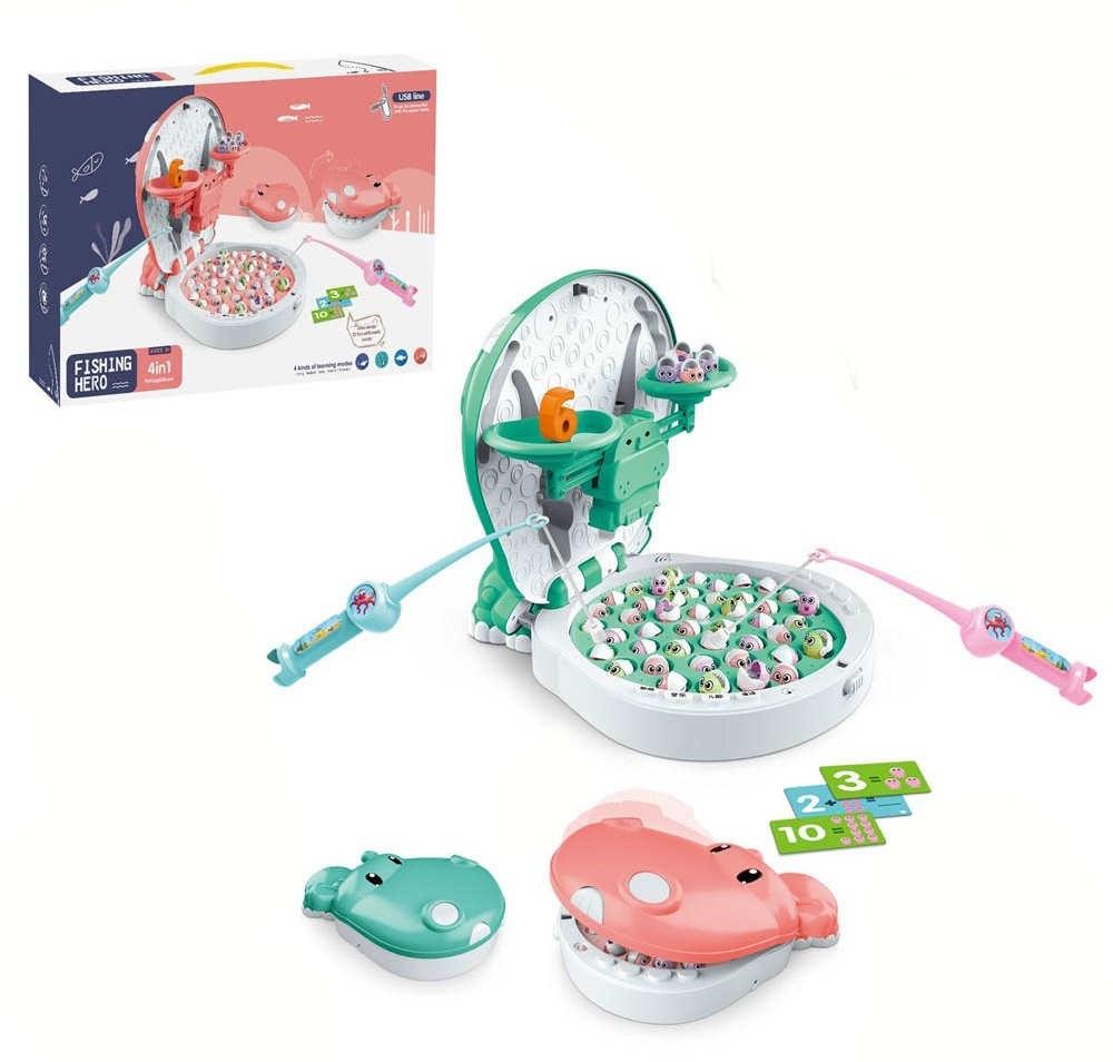 Zestaw zawiera platformę w kształcie hipopotama oraz 2 wędki, 45 rybek, 12 kart z zadaniami arytmetycznymi, kabel USB. Zasilanie 3 x bateria AA (nie załączono) lub USB podłączone do telefonu. Gra nie działa po podłączeniu baterii i USB.