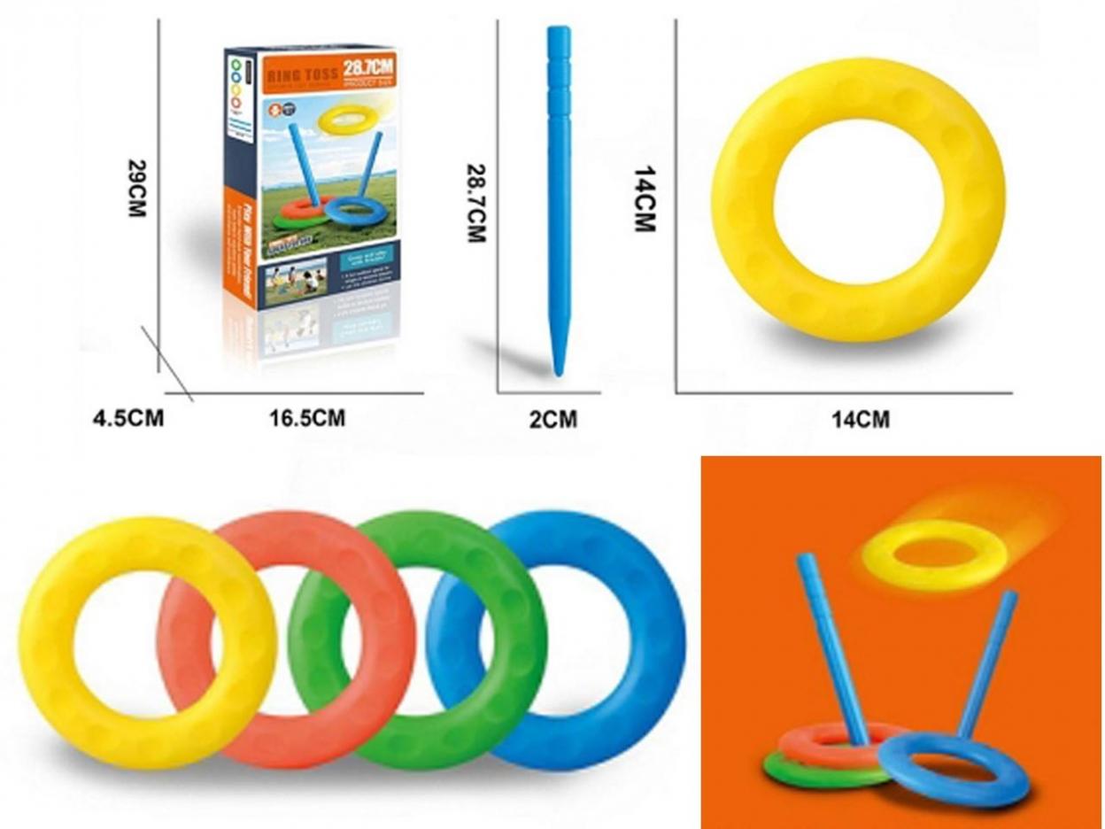 Klasyczna gra zręcznościowa dla dzieci i całej rodziny! Zadaniem graczy jest rzucanie kolorowymi obręczami tak, aby trafić na pionowy słupek. Idealna do zabawy w ogrodzie, na plaży, podczas pikniku czy urodzin. Gra rozwija koordynację ruchową, celność oraz koncentrację, a przy tym zapewnia mnóstwo radości i zdrowej rywalizacji. Zawartość zestawu: 2 słupki; 4 kolorowe obręcze; Wymiary: Wysokość słupka: 28,7 cm; Średnica obręczy: 14 cm; Szerokość słupka: 2 cm. Wymiary opakowania: Wysokość: 29 cm; Szerokość: 16,5 cm; Głębokość: 4,5 cm. Lekka, łatwa w montażu i przenoszeniu - świetna propozycja do aktywnej zabawy na świeżym powietrzu.