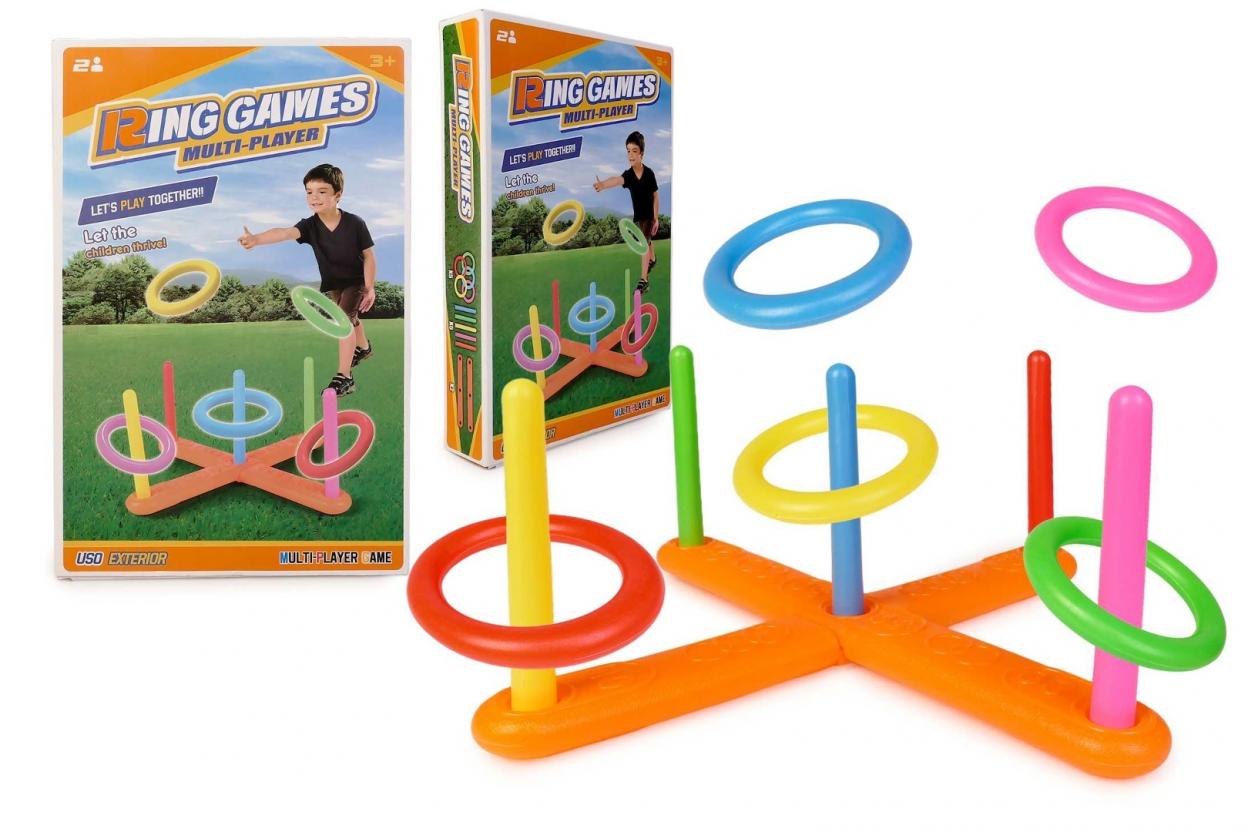 W zestawie: 5 kolorowych obręczy - średnica: 13 cm, , 5 pionowych słupków wys.: 16,5 cm, 2 czerwone poprzeczki tworzące podstawę, funkcje: gra polega na rzucaniu obręczami i trafianiu w słupki, można grać w pojedynkę lub w kilka osób, wym. opakowania: 23,5 x 36 x 6 cm, 3+