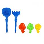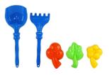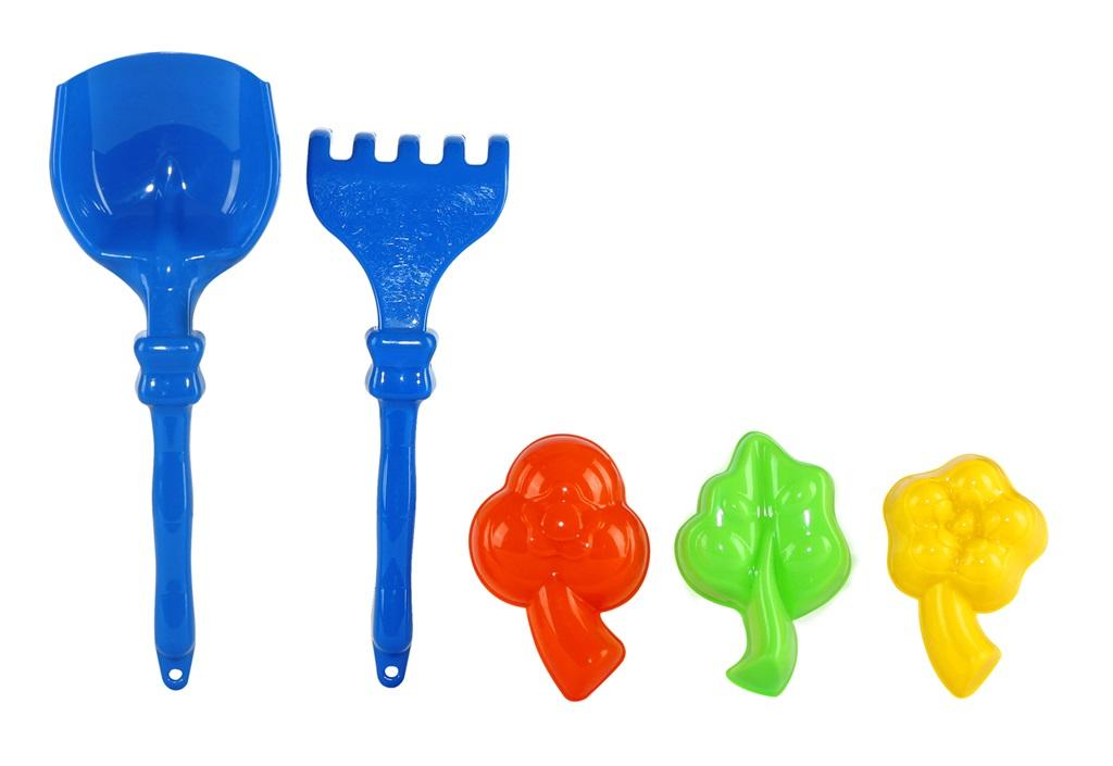 Zabawka składa się z 5 akcesoriów do piasku: średnich grabek i łopatki oraz 3 foremek w kształcie liści. Produkt wykonany jest z trwałych i bezpiecznych materiałów, dzięki czemu może nim się bawić każde dziecko. Zabawka sprzedawana jako mix kolorów.