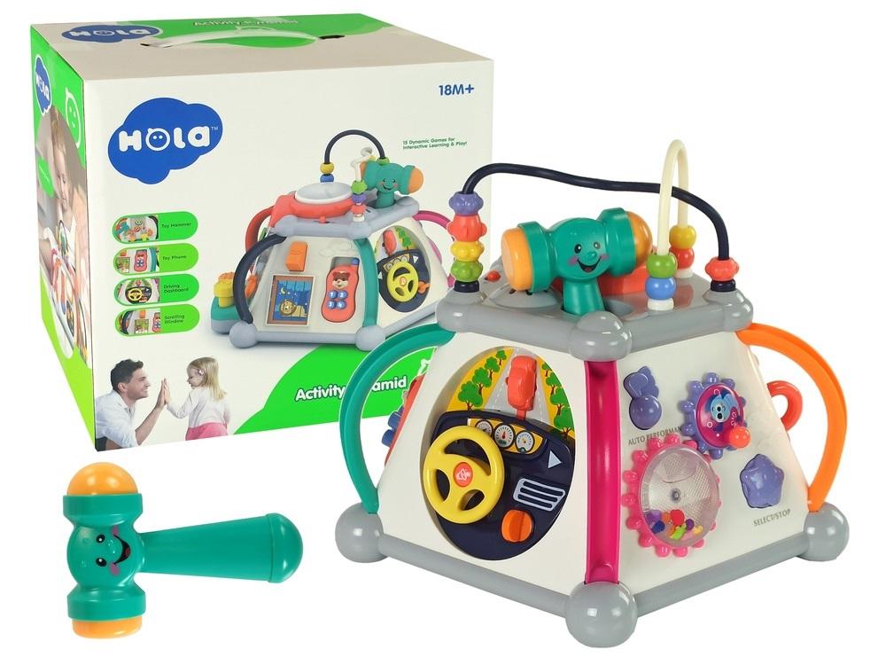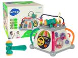 MULTIFUNKCYJNA BAJKOWA KOSTKA BOX 5 PŁASZCZYZN ZABAWY !! Rozwija zdolności manulane oraz wyobraźnię maluszka Kostka posiada pięć interaktywnych płaszczyzn bocznych i jedną górną. Każda płaszczyzna jest inna i zaskakuje nas swoimi propozycjami zabawy. Solidne wykonanie i żywa kolorystyka dodatkowo przyciągają naszą uwagę. Zabawka na pewno zaciekawi nawet najbardziej wymagające pociechy. WYMIARY ZABAWKI: - wysokość 24 cm, - szerokość 29 cm. PŁASZCZYZNA POMARAŃCZOWA to kącik dla prawdziwego pasjonata kierownicy. Posiada: - kluczyk w stacyjce, który po przekręceniu wydaje odgłos zapalanego silnika, - ruchomą kierownicę, która kieruje autkiem, - na kierownicy klakson z efektem świetlnym i dźwiękowym. Całość jest zapakowana w estetyczne kolorowe pudełko typu "walizka", idealnie nadające się na prezent. To bardzo efektowne i magiczne pudełko zasilane jest trzema bateriami typu AA (zwykłe paluszki) - brak w zestawie.