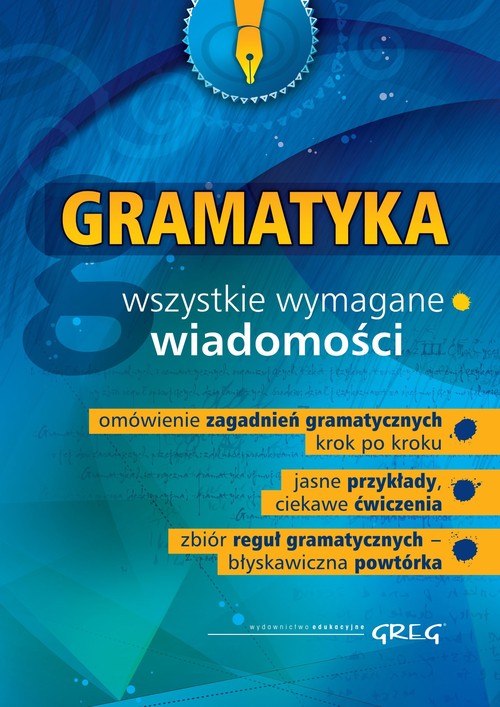 Lekcje gramatyki w szkole podstawowej i w gimnazjum należą do najtrudniejszych. Aby ułatwić uczniom opanowanie tego materiału, Wydawnictwo Greg oferuje książkę pt. Gramatyka w szkole podstawowej i w gimnazjum. Opracował ją nauczyciel języka polskiego, znający problemy i kłopoty swoich wychowanków. Wszystkie zagadnienia zostały omówione w sposób prosty i zrozumiały, a utrwalanie wiadomości ułatwiają rozdziały powtórkowe. W książce można też znaleźć wiele ćwiczeń, a polecenia krok po kroku poprowadzą ucznia do prawidłowego ich rozwiązania. Na końcu każdej części książki znajduje się rozdział Błyskawiczna powtórka, w którym zebrano potrzebne wiadomości.Spis treściFonetyka - czyli nauka o głoskachCo to jest fonetyka?Jak powstaje głos?Głoska a literaKlasyfikacja spółgłosekKlasyfikacja samogłosek (tylko dla ciekawych)UpodobnieniaWymowa krakowsko-poznańskaWymowa warszawskaAkcent wyrazowyAkcent zdaniowyBłyskawiczna powtórkaSłowotwórstwo - czyli nauka o tworzeniu słówBudowa i znaczenie wyrazówWyrazy podzielne i niepodzielne słowotwórczoRodzina wyrazówWyrazy podstawowe i pochodneBudowa definicji słowotwórczejPodstawa słowotwórcza i formantOboczności samogłoskowe i spółgłoskowe w obrębie podstawy słowotwórczejRodzaje formantówFunkcje formantów słowotwórczychKategoria a typ słowotwórczyProduktywny i nieproduktywny typ słowotwórczyPodstawowe kategorie rzeczowników pochodnych Kategorie znaczeniowe rzeczowników odrzeczownikowych Kategorie znaczeniowe rzeczowników odczasownikowych Kategorie znaczeniowe rzeczowników odprzymiotnikowychTworzenie wyrazów pochodnych bez zmiany ich znaczeniaWyrazy złożoneKłopotliwy łącznikSkrótowceNeologizmyNazwy własne, osobowe i miejscoweBłyskawiczna powtórkaFleksja - czyli nauka o częściach mowyZasady klasyfikacji wyrazów na części mowyRzeczownikCzasownikPrzymiotnikLiczebnikPrzysłówekZaimekPrzyimekSpójnikWykrzyknikPartykułaBłyskawiczna powtórkaSkładnia - czyli nauka o zdaniuJak się porozumiewamy?Podział zdań ze względu na cel wypowiedzi. Zdania oznajmujące, rozkazujące, pytające, wykrzyknieniaZdanie a równoważnik zdaniaZdania rozwinięte i nierozwinięteZdanie pojedyncze. Części zdaniaZdanie złożone z podrzędnymi: podmiotowym, orzecznikowym, dopełnieniowym, okolicznikowym, przydawkowymZdania złożone współrzędnieSzyk zdań składowych w zdaniach złożonychJaką rolę w zdaniu pełnią poszczególne części mowyImiesłowowy równoważnik zdaniaZwiązki wyrazów w zdaniuWyrazy poza związkamiMowa zależna i niezależnaBłyskawiczna powtórkaMini-ściąga