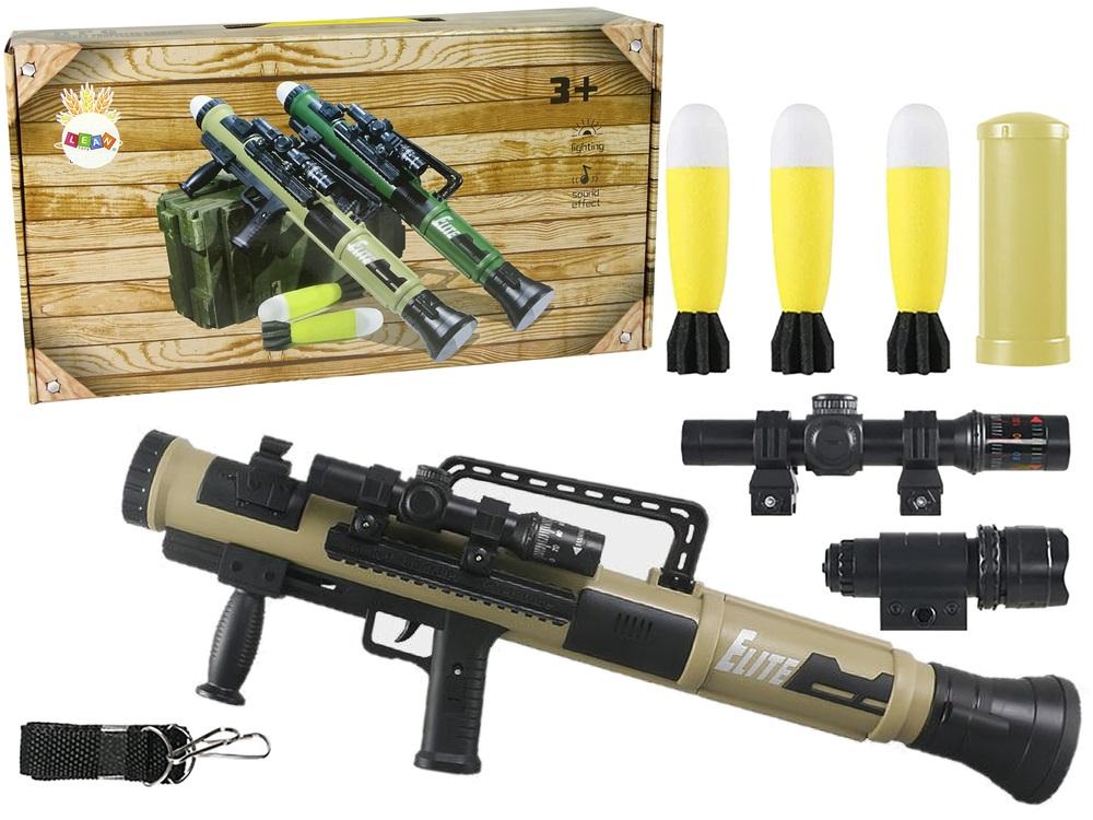 Granatnik RPG Pociski Wyrzutnia Rakiet Światło Dźwięk Militarne zabawki to zazwyczaj po prostu figurki żołnierzyków imitujące pole walki lub pistolety na kulki. Oferowany granatnik to zabawka będąca nie tylko atrapą sprzętu militarnego, ale i w pełni działająca zabawkowa broń. Zabawka ta została zaprojektowana z myślą o małych żołnierzach, którzy upodobali sobie ten bohaterskim zawód. Dzięki tej zabawce każdy maluch może poczuć się jak nieustraszony dowódca na prawdziwym polu bitwy. Czas na obronę. Jak strzelać ? Wystarczy nabić pociski poprzez specjalnie dołączone narzędzie, następnie wrzucić do lufy granatnika, przeładować i nacisnąć spust i strzał! Specjalnie zamontowana sprężyna powoduje wyrzut wraz z realistycznym dźwiękiem wybuchu i strzałów. Granatnik jest niesamowicie wyposażony. Po boku znajduje się latarka, która będzie oświetlać okolice, na górze znajduje się okular, który pomoże w precyzji strzału. Okrągły tył pistoletu pozwoli na oparcie pistoletu na ramieniu, co ustabilizuje pozycje i zwiększy celność strzału. Pociski są całkowicie bezpieczne, otoczone miękką pianką. Odkręcając górną część pocisku głowice, można uruchomić efekty świetlne. Duży efekt daje zasięg strzału! Obroń swoje terytorium! I ciesz się zabawą! Wymiary granatnika: 70 cm x 23 cm x 10 cm średnica lufy: 7 cm Wymiary pocisku: 22 cm x 5 cm x 5 cm Wymiary opakowania: 50 cm x 27 cm x 11 cm Zestaw przeznaczony jest dla wszystkich powyżej 3. roku życia. Pociski i wyrzutnia posiada certyfikat CE, co w połączeniu ze zgodnością z normą EN 71 jest gwarancją bezpieczeństwa płynącego z użytkowania. Zasilany jest łącznie 12 x AG13, w zestawie.