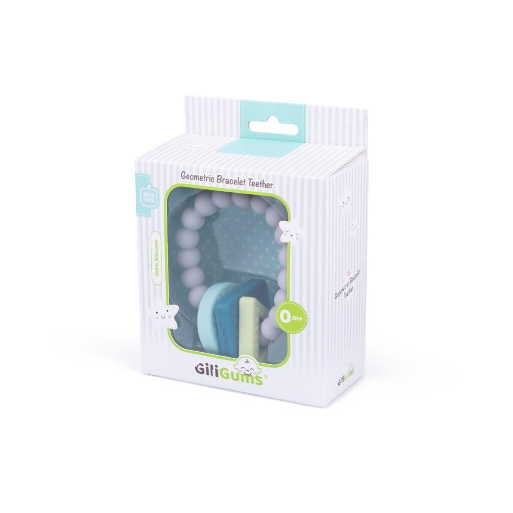 Stylowy, silikonowy gryzaczek bransoletka z trzema zawieszkami w kształcie figur geometrycznych. Każda z zawieszek posiada inny kolor i fakturę. Zdobią je wypustki, które delikatnie masują dziąsła dziecka, przynoszą mu ulgę w ząbkowaniu. Gryzaczek jest miękki i odporny na zgniatanie.