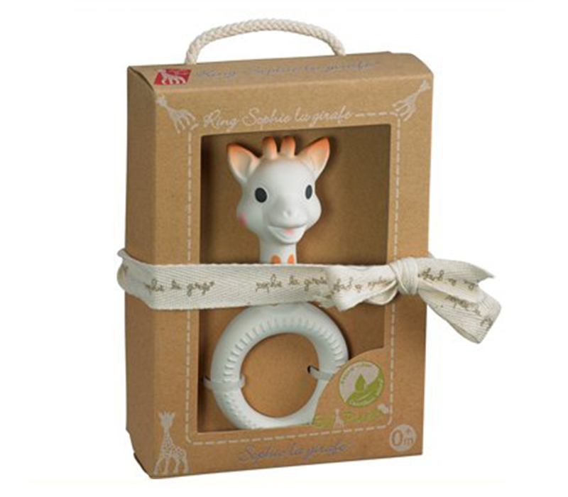 Gryzak główka Żyrafy Sophie z kółkiem, wykonany w 100% z naturalnego kauczuku i pokryty farba spożywczą, wspomaga go w trudnym okresie ząbkowania. Wszystkie części gryzaka nadają się do gryzienia zarówno uszy i rogi Sophie jak również kółko, którego powierzchnia ma specjalnie zróżnicowana powierzchnię by przynosić ulgę swędzącym dziąsłom. Lekki i łatwy do chwytania dla małych rączek, chroni przed bolesnym uderzeniem. Ciemne oczy i cętki stymulują wzrok maluszka, a zapach naturalnego kauczuku węch. Dzięki charakterystycznemu zapachowi maluszek jest w stanie odróżnić gryzak wśród pozostałych zabawek.