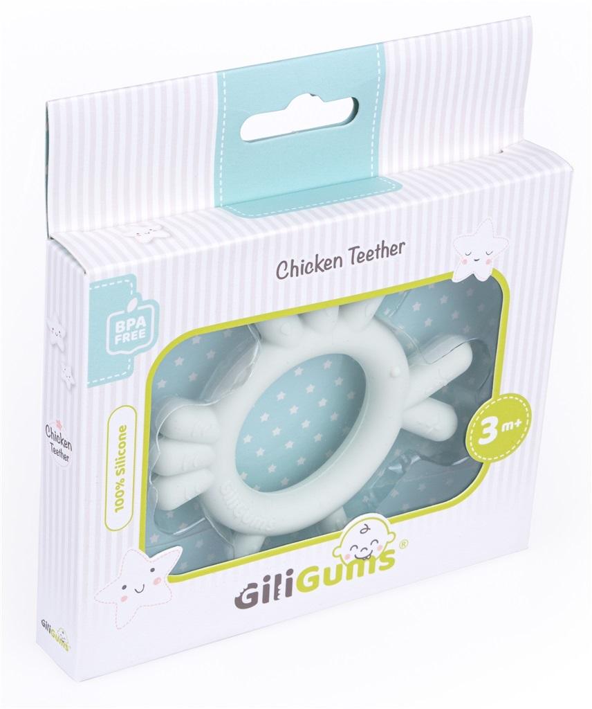 Silikonowy gryzak w kształcie kurczaka sprawdzi się idealnie u każdego ząbkującego maluszka. Jego zróżnicowana powierzchnia sprawia, że podczas gryzienia, delikatnie masuje on obolałe dziąsła dziecka. Kształt kurczaka jest idealnie dostosowany do małych rączek, co ułatwia jego chwytanie. Śliczny, pastelowy kolor czyni gryzak także stylowym dodatkiem dla każdego modnego bobasa.