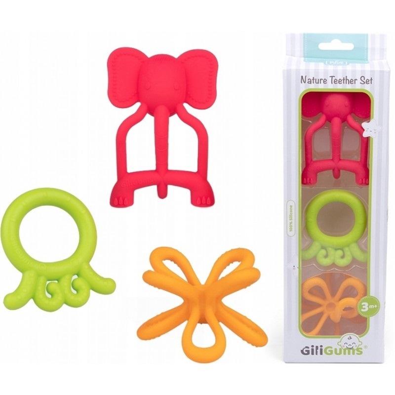 • w zestawie 3 gryzaki: czerwony słoń, zielona ośmiornica, pomarańczowy kwiatek