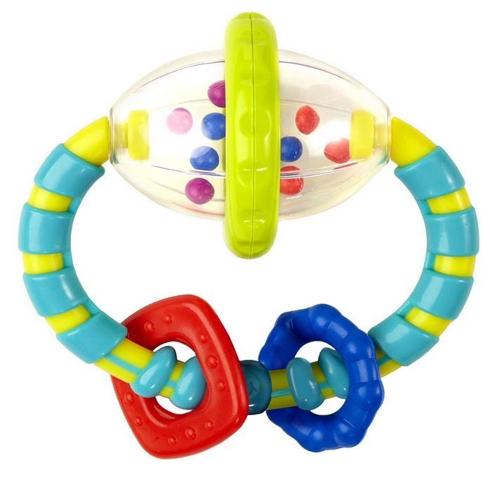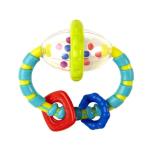 Zabawka składa się z trzech części. Pierwsza z nich to obrotowa grzechotka z kolorowymi koralikami. Druga część to dwa koraliki o wesołych kształtach, wypukłych wzorach oraz zróżnicowanej strukturze powierzchni, doskonałej dla ząbkującego maluszka. Trzecia część to wykonana ze specjalnego tworzywa, łatwa do chwytania obręcz, która dzięki swojej strukturze nie wyślizguje się z rączek, a także stanowi dodatkową atrakcję poznawczą dla dziecka. Zabawka przeznaczona dla dzieci od dnia narodzin.