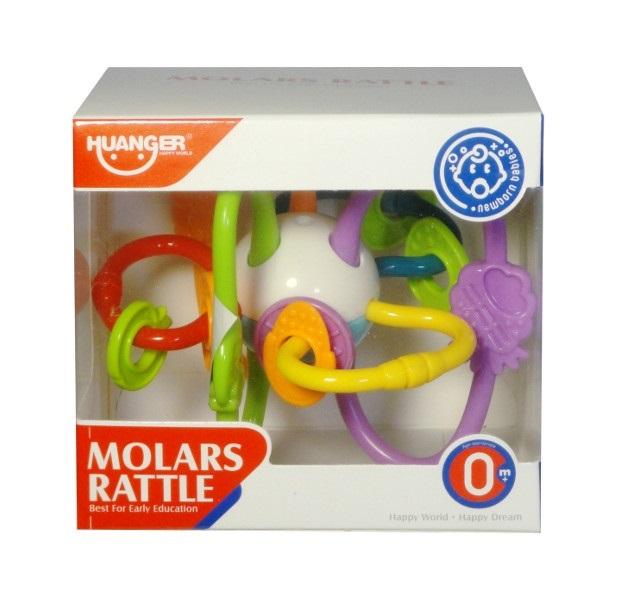 Zabawka grzechotka dla dzieci. Zabawka posiada poręczne dla dzieci uchwyty co oddziałuje u nich na zmysł dotyku. Zabawka ma także, kolorowe elementy co oddziałuje na zmysł wzroku u dzieci. Produkt zapakowany w kartonowe opakowanie.
