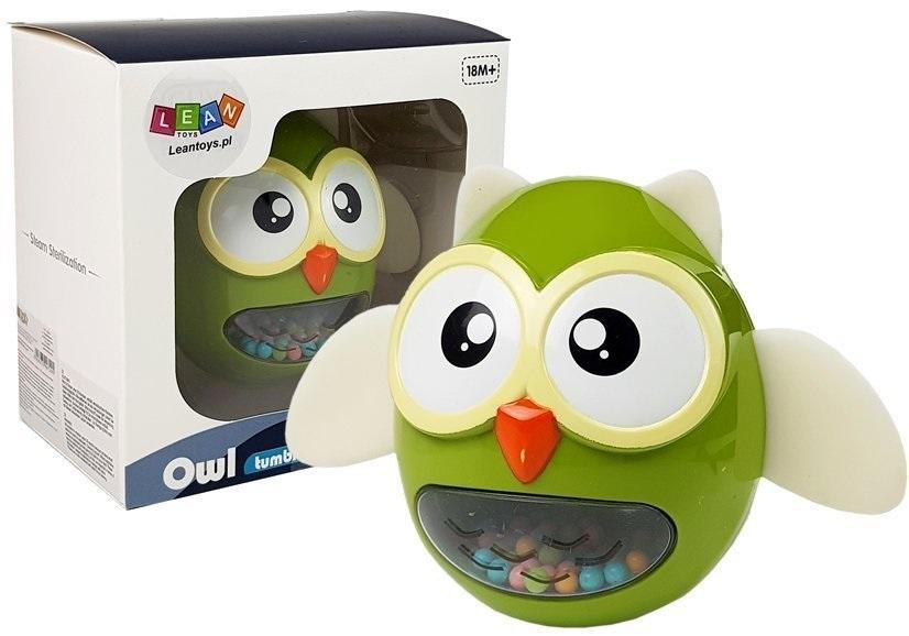 Fantastyczna zabawka dla najmłodszych. Jest to grzechotka z elementami gryzaczka, który idealnie rozwija zmysł dotyku, czucia i nauki chwytania. Grzechotka jest wyjątkowo trwała, praktycznie niezniszczalna, może być używana przez dzieci w każdym wieku. Uszka oraz skrzydełka sowy są wykonane z miękkiej gumy. Te właśnie części mogą posłużyć dziecku jako gryzaczek podczas ząbkowania. Grzechotka jest łatwa do uchwycenia i utrzymania w rączkach dziecka. Zabawka została wykonana w pięknych pastelowych kolorach, ten model jest w kolorze zielonym. Dodatkową zaletą jest funkcja zabawki, która utrzymuje równowagę. Wańka wstańka to pierwsza ulubiona zabawka, która już stała się tradycyjną. Zabawki tego typu nadal są uwielbiane przez dzieci na całym świecie. Dziecko przewraca zabawkę jednak ona dzięki odpowiednio wbudowanemu środkowi ciężkości wciąż wraca do pionu, jest to fascynująca sprawa dla małych odkrywców.