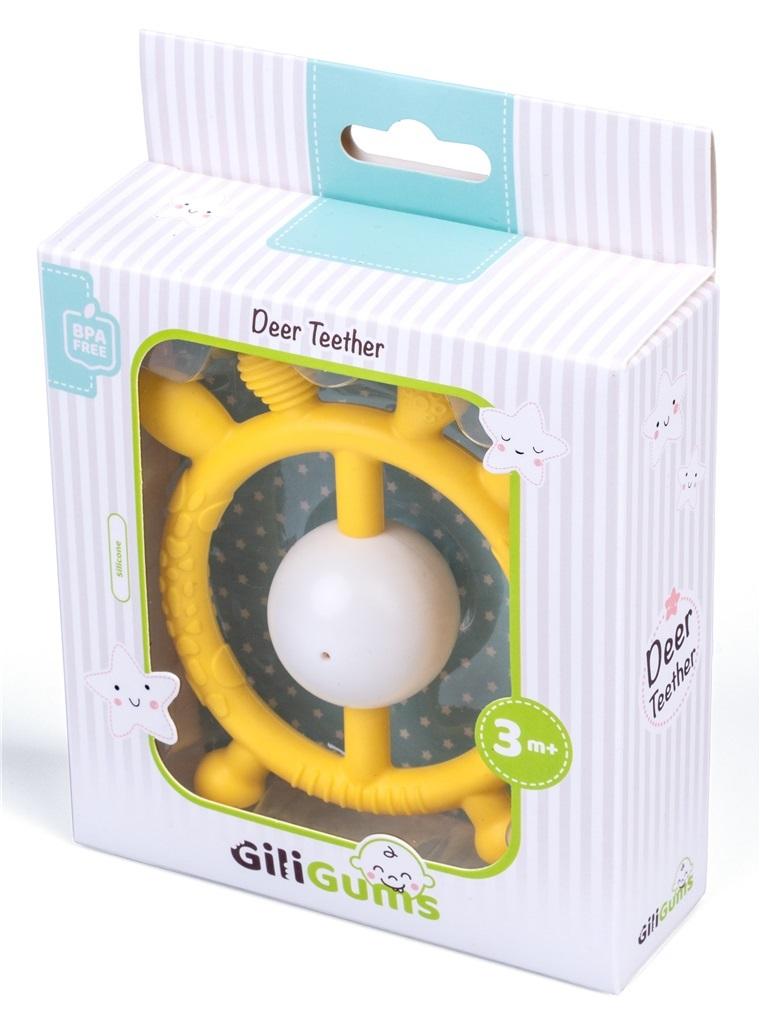 Gryzaczek i grzechotka w jednym! Ten wesoły jelonek w pięknym, słonecznym kolorze przyniesie ulgę ząbkującemu maluszkowi. Zróżnicowane faktury gryzaka delikatnie masują dziąsła, a jego kształt ułatwia małym rączkom chwytanie zabawki.