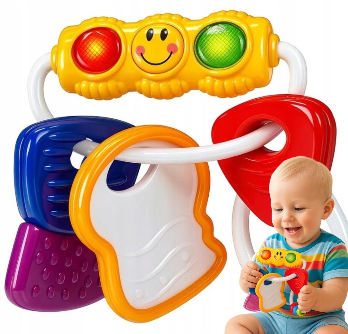 Zabawka (grzechotka gryzak) w kształcie kluczy, nasycona oraz intensywna kolorystyka zachęca do aktywnej zabawy. Wspiera rozwój dużej i małej motoryki, a także pobudza malucha sensorycznie. W zestawie trzy kluczyki w różnych kształtach liczydełko z koralikami panel z guziczkami i światełkami. Wyróżnia się funkcjonalnością 2-w-1: pełni rolę zarówno grzechotki, jak i gryzaka, a dodatkowo posiada efekt świetlny, który przyciąga uwagę i wspiera rozwój zmysłów.