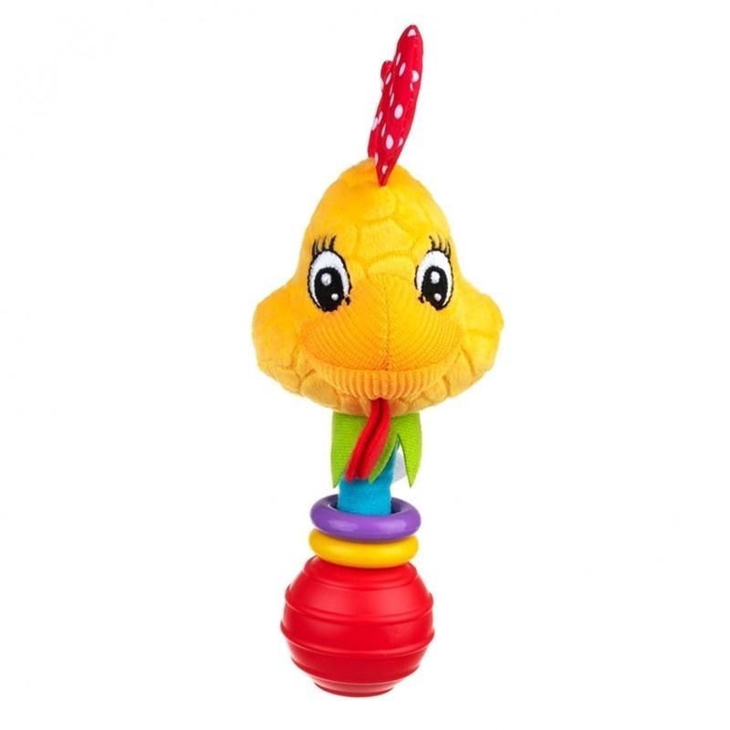 Ten wesoły kogucik to prawdziwy gaduła! Wciąż grzechocze o wszystkim co nowego zobaczył. Jest on dumnym posiadaczem pięknego szeleszczącego grzebienia i ruchomych pierścieni, które zdobią jego długą szyję. Kiedy maluch potrząśnie kuleczką, na której siedzi Rufus, kogut będzie bujał się na wszystkie strony radośnie grzechocząc. Zabawka przeznaczona dla dzieci od dnia narodzin.