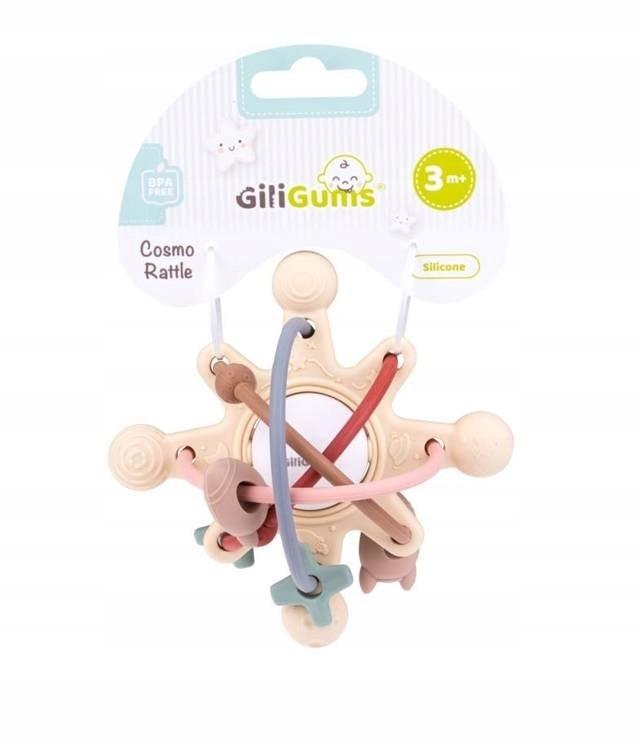 Kosmiczna grzechotka to moc odlotowej zabawy w stylowej odsłonie! Zabawka posiada w swym wnętrzu kuleczkę, która grzechocze przy potrząsaniu. Naokoło niej znajdują się miękkie linki a ruchomymi elementami do przesuwania. Jakby tego było mało, zabawka wyposażona została także w wypustki, przez co sprawdzi się również w roli gryzaka. Jej kształt pasuje idealnie do rączek malucha, co ułatwia najmłodszym chwytanie grzechotki.