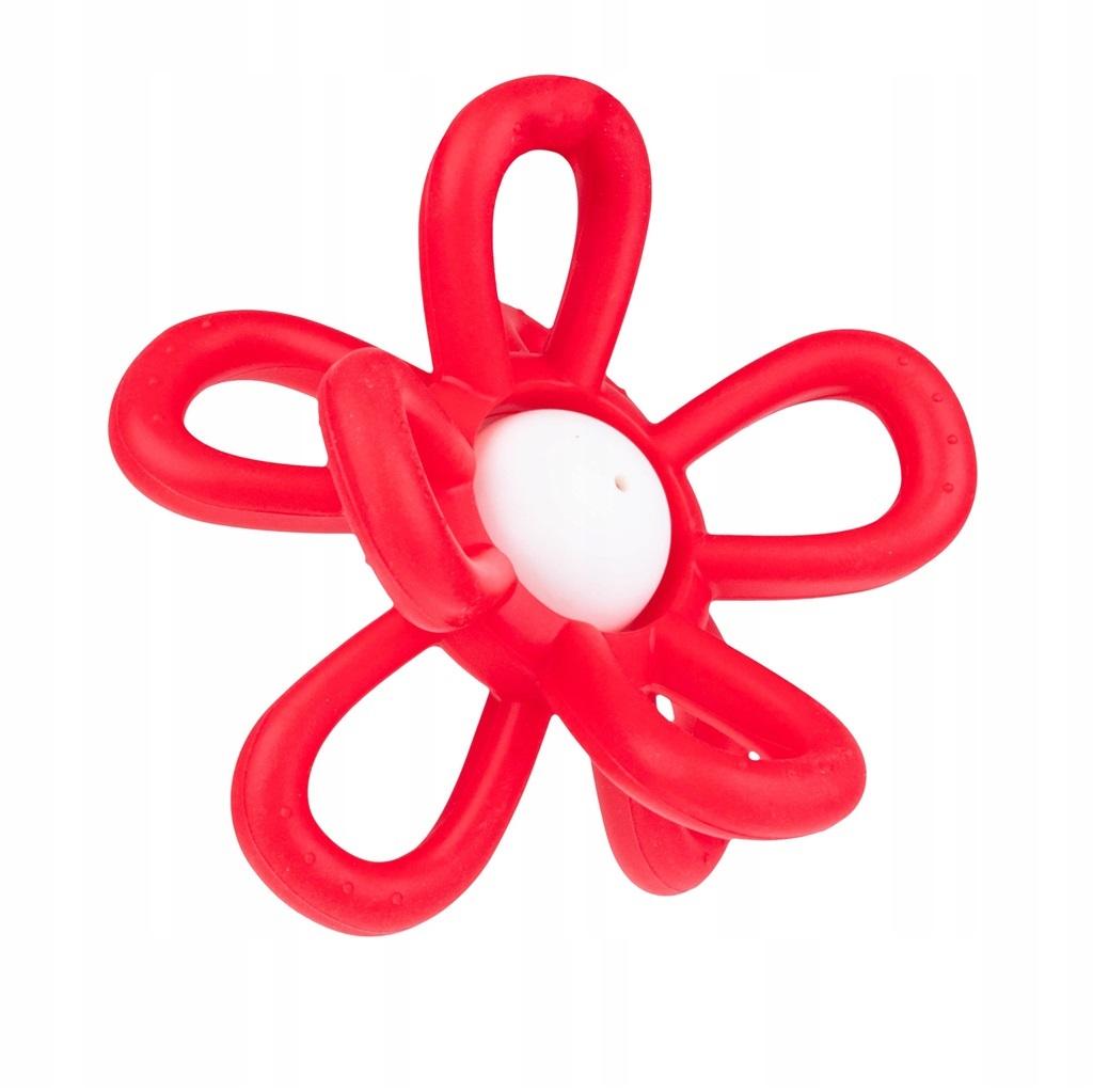 Czerwona grzechotka w kształcie kwiatka nie tylko pięknie wygląda, ale jeszcze wydaje wesoły dźwięk przy potrząsaniu. We wnętrzu zabawki kryje się grzechocząca kula, a naokoło niej znajdują się płatki w formie elastycznych pętelek. Ich kształt został stworzony specjalnie dla małych rączek, aby ułatwiać najmłodszym chwytanie zabawki. Praktyczne wypustki, zdobiące pętelki, pozwolą korzystać z nich także w formie gryzaka