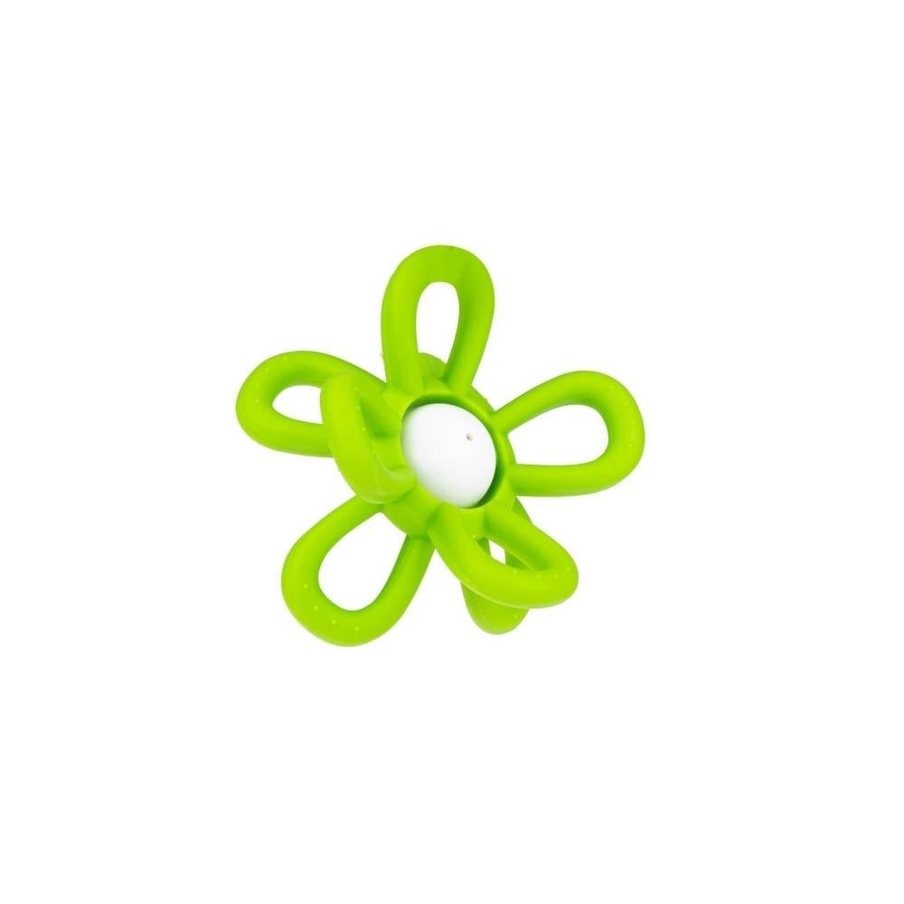 Zieloniutki kwiatek zabawi malucha wesołym grzechotaniem! We wnętrzu zabawki kryje się grzechocząca kula, a naokoło niej znajdują się elastyczne płatki- pętelki, które ułatwiają najmłodszym chwytanie zabawki. Pętelki zdobią wypustki, dzięki którym sprawdzą się ona także w roli gryzaka.