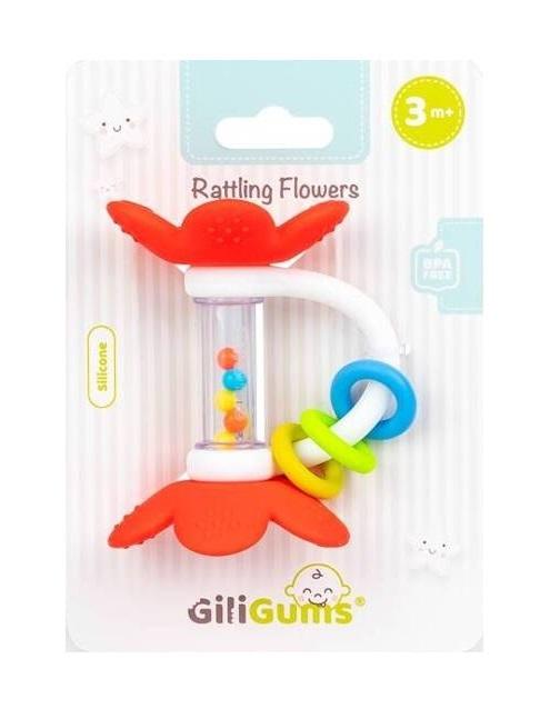 Urocza grzechotka, ozdobiona z dwóch stron silikonowymi kwiatkami, to wspaniały dodatek dla każdego bobasa! Zapewni wesołe zajęcie, a dodatkowo, za sprawą praktycznych wypustek, zdobiących płatki kwiatów, przyniesie ulgę obolałym dziąsełkom ząbkującego malucha. Zabawka wyposażona została w kolorowe koraliki, które wydają miły dla ucha dźwięk przy potrząsaniu grzechotką. Praktyczny uchwyt z ruchomymi kółeczkami ułatwi małym rączkom chwytanie zabawki.