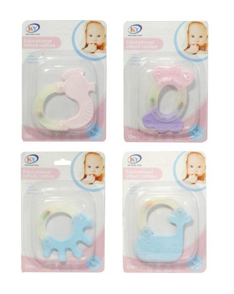Kolorowa grzechotka - gryzaczek w zabawnym kształcie. Wewnątrz w zabawce znajdują się kolorowe kuleczki które wydają dźwięki. Oddziałuje ona na zmysł wzroku, dotyku i słuchu. Produkt przeznaczony dla dzieci od pierwszych dni życia. Podane wymiary są wymiarami opakowania. Zabawka zapakowana w kartonowa podstawkę z przezroczystym kloszem. Produkt występuje w kilku wersjach kolorystycznych, wybierany losowo. Cena dotyczy jednej sztuki.