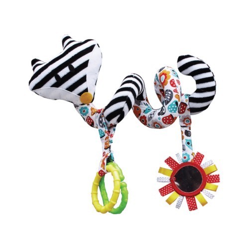 Mięciutka spiralka wózkowa od Mom's care została stworzona z myślą o najmłodszych. To właśnie w pierwszym okresie życia dziecka kluczową rolę odgrywa stymulacja zmysłów. Do uszycia grzechotek używamy bezpiecznych tkanin o różnej strukturze. Dzięki temu dziecko poznaje świat i stymuluje zmysł dotyku. Nie zapominamy także o prawidłowym rozwoju zmysłu wzroku. Na samym początku nasze pociechy nie dostrzegają kolorów i nie odróżniają kształtów. Skupiając wzrok na biało-czarnych wzorach niemowlę zwiększa efektywność swojego mózgu. Dodatkowe metki, kolorowe kółeczka, miękkie i bezpieczne dla dziecka lusterko, sprawiają, że maluch poprzez zabawę ćwiczy również małą motorykę, sprawność paluszków i koordynację ręka-oko. Delikatny dźwięk grzechotki dostarcza bodźce słuchowe i wzrokowe wzbudzając zainteresowanie najmłodszych.