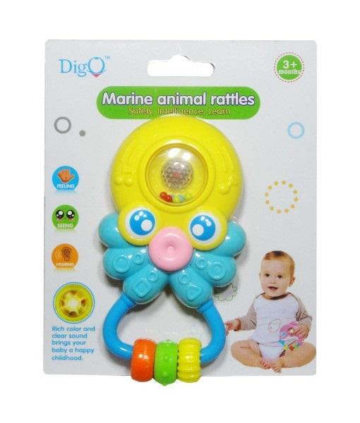 Urocza grzechotka dla dzieci w kształcie ośmiornicy. Grzechotka posiada ruchome elementy (3 kolorowe kółeczka o różnej fakturze co oddziałuje na zmysł dotyku, kolorowe kulki wewnątrz działają na zmysł słuchu, jak również zabawka świeci kolorowym światełkiem.