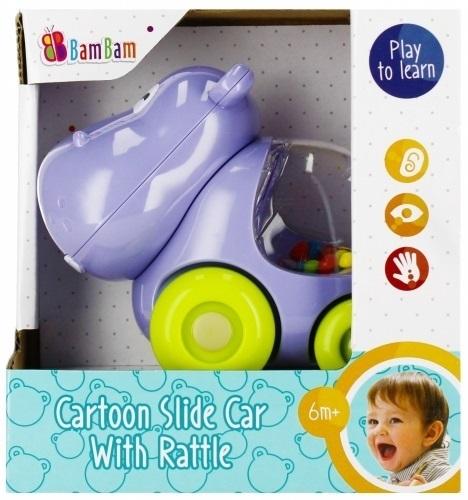 Grzechotka - Autko o kształcie uroczego Hipcia z obracającymi się kuleczkami w brzuszku zachwyci niejednego maluszka. Jeżdżący zwierzaczek z kuleczkami Bam Bam zapewnia masę zabawy, mobilizując dziecko do podejmowania samodzielnych prób raczkowania czy też chodzenia. Zabawka podczas poruszania wydaje szeleszczące dźwięki, dzięki tęczowym kuleczkom umieszczonym w brzuszku zwierzaczka. Dodatkowo obracające się, bajecznie kolorowe kuleczki dostarczają bodźców wzrokowych wspierając rozwój zmysłów wzroku oraz percepcji. Obły kształt ułatwia chwytanie zabawki, a kółka umożliwiają wprawianie zabawki w ruch bez trudu za pomocą pchnięcia.