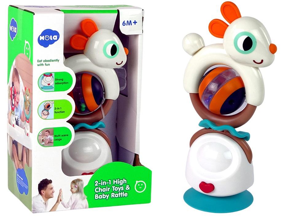 Grzechotka Sensoryczna Dla Niemowląt Królik Stojak Przyssawka Prawidłowy rozwój i uśmiech na twarzy dziecka jest bardzo istotną kwestią. Funkcje, jakie posiada ta zabawka, sprawią, że dziecko już od najmłodszych lat zacznie rozróżniać i uczyć się nowych kolorów, dźwięków i kształtów. Pobudza wiele zmysłów małego człowieka, pomagając mu odkryć otaczający go świat. Urocza grzechotka królik obraca się o 360 stopni, wewnątrz jednej z nóżek znajdują się kolorowe koralki, które wydają dźwięki. Zabawka ma także podstawę z przyssawką, która zapobiega przewróceniu lub rzuceniu jej na podłogę podczas zabawy, ale wprawia ją w ruch, dzięki czemu buja się na boki. Można bawić się nią dosłownie wszędzie wystarczy, aby powierzchnia była płaska, może podłoga, taca do jedzenia lub stolik na każdej. Dwie opcje zabawy stabilnie na stoliku, bądź dzięki rączce. Jak usunąć podstawkę? Wystarczy nacisnąć serduszko na samym dole, pociągnąć i mamy samą grzechotkę, którą dziecko może trzymać w swoich rękach. Wykonana jest z wysokiej jakości certyfikowanego plastiku, który jest w pełni bezpiecznym materiałem dla małego dziecka. Uszy i mały okrąg wyprodukowane są z miękkiego tworzywa, co jest gwarancją, że dziecko nie wyrządzi sobie krzywdy podczas wesołej zabawy. Wymiary zabawki: 22 cm x 8 cm x 8 cm Wymiary opakowania: 24 cm x 11 cm x 15 cm Przeznaczona jest dla wszystkich maluszków, które osiągnęły 6 miesiąc życia.