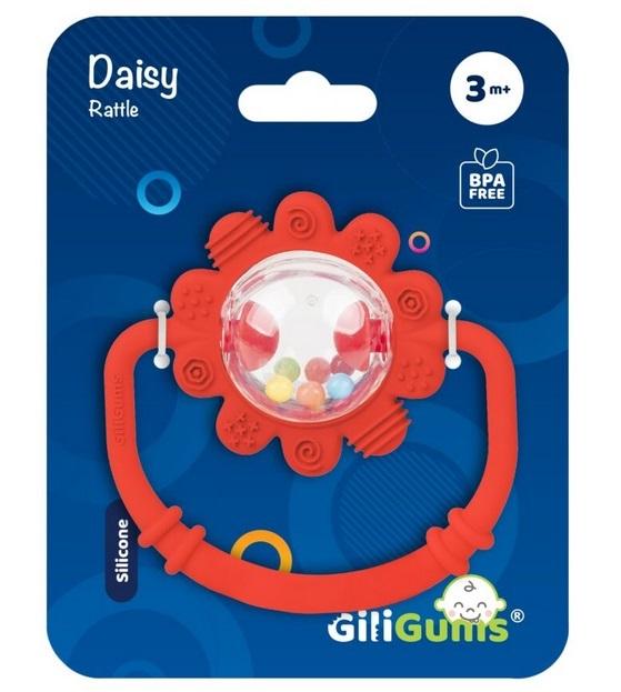 Grzechotka w czerwonym kolorze zabawi, stymulując przy tym zmysły malucha! W środku znajduje się przezroczysta kula, wypełniona grzechoczącymi kuleczkami, którą okalają miękkie płatki ze zróżnicowanymi wypustkami. Przy potrząsaniu, zabawka wydaje wesoły dźwięk, a przy gryzieniu płatków kwiatka, wypustki masują podrażnione ząbkowaniem dziąsła. Dopasowany do małych rączek kształt i fakturowany uchwyt, ułatwiają chwytanie grzechotki.
