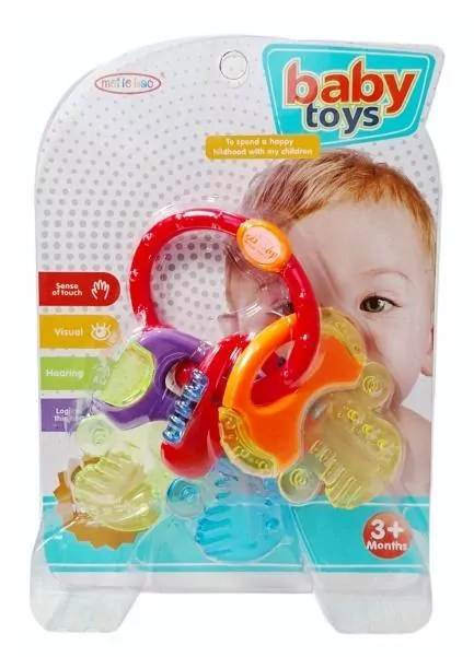Kolorowy gryzak dla niemowląt z różnorodnymi kształtami i fakturami. Zapakowany w kartonowe pudełko. Zabawka przeznaczona dla dzieci od 3 miesiąca życia.