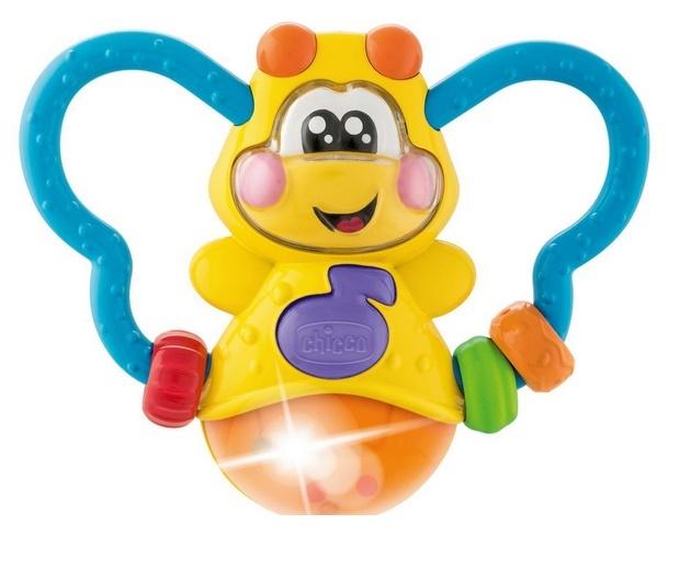 Elektroniczna grzechotka o kształcie świetlika bawi dziecko dźwiękami i wesołymi melodiami, pomagając mu w najbardziej subtelny sposób w rozwoju zmysłów, szczególnie słuchu, wzroku i dotyku. Dźwięki i melodie stymulują słuch dziecka, a kolorowe pierścienie zaczepione na niebieskich, ergonomicznych uchwytach, dziecko może przesuwać w górę i w dół i, w ten sposób, trenować małą motorykę. Grzechotkę-świetlika dziecko będzie pewnie trzymało w rączkach dzięki wygodnym uchwytom, które wyglądają jak skrzydełka owada.