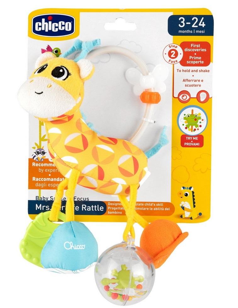 Grzechotka z postacią zabawnej żyrafy z różnymi tkaninami, zawieszką w postaci piłeczki i elementami plastikowymi.