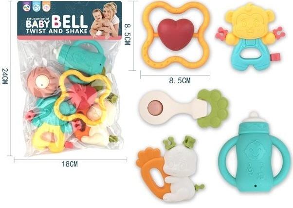 Zestaw edukacyjnych grzechotek i gryzaków Twist and Shake to kompleksowa propozycja wspierająca rozwój sensoryczny Twojego dziecka. W skład zestawu wchodzi pięć unikalnych zabawek, które łączą w sobie funkcję dźwiękową z elementami kojącymi dziąsła. Znajdziemy tu między innymi żółtą małpkę z ruchomymi elementami, gryzak z motywem serca w ozdobnej ramce, sensoryczną kość z wypustkami, białego króliczka trzymającego marchewkę oraz niebieską butelkę z uchwytami.