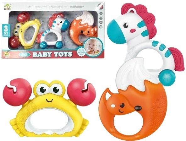Zestaw kolorowych gryzaków i grzechotek dla niemowląt - Trzy urocze zwierzątka. Podaruj swojemu maluszkowi radość i ulgę w okresie ząbkowania dzięki temu uroczemu zestawowi trzech kolorowych gryzaków i grzechotek. W skład zestawu wchodzą trzy sympatyczne zwierzątka: wesoły żółty krab z dużymi szczypcami, przyjazny biało-niebieski konik z różową grzywą oraz sprytny pomarańczowy lisek z miękkim ogonkiem. Każda zabawka została zaprojektowana z myślą o małych rączkach i buziach. Różnorodne kształty i tekstury stymulują zmysł dotyku dziecka, a wbudowane grzechotki delikatnie dźwięczą, rozwijając zmysł słuchu i ciekawość. Gryzaki wykonane są z bezpiecznych, nietoksycznych materiałów, które są miękkie i elastyczne, idealne do masowania swędzących dziąseł podczas ząbkowania. Intensywne kolory i przyjazne buźki zwierzątek przyciągają wzrok dziecka i zachęcają do zabawy. Ten trzyczęściowy zestaw to doskonały pomysł na prezent dla noworodka lub niemowlęcia. Zapewni maluszkowi zajęcie, rozwój sensoryczny i ulgę w trudnym okresie ząbkowania. Cechy produktu: Zestaw zawiera 3 urocze gryzaki/grzechotki w kształcie: kraba, konika i liska. Różnorodne tekstury stymulują zmysł dotyku. Delikatne grzechotki rozwijają zmysł słuchu. Wykonane z bezpiecznych i nietoksycznych materiałów. Idealne do łagodzenia bólu dziąseł podczas ząbkowania. Jasne, przyciągające wzrok kolory. Ergonomiczny kształt dostosowany do małych rączek. Doskonały pomysł na prezent.