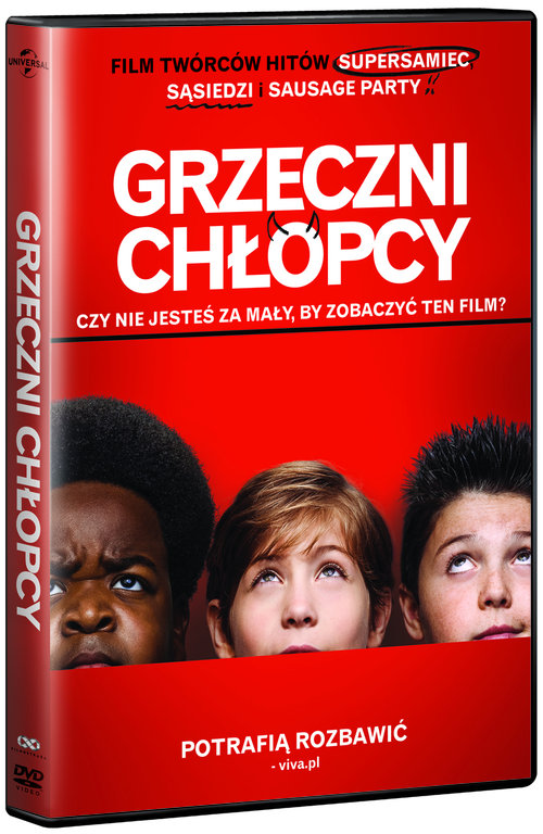 FILM TWÓRCÓW HITÓW „SUPERSAMIEC”, „SĄSIEDZI” i „SAUSAGE PARTY” GRZECZNI CHŁOPCY CZY NIE JESTEŚ ZA MAŁY, BY ZOBACZYĆ TEN FILM? Potrafią rozbawić- viva.pl "Grzeczni chłopcy" wyrośli na najbardziej niegrzeczną komedię tego roku- Radosław Krajewski, Gamerweb Ile złego może wydarzyć się jednego dnia? Ludzie odpowiedzialni za „Supersamca” i „Sausage Party” tym razem wzięli się za szóstoklasistów – w niewinnej, choć sprośnej komedii. Zamiast do szkoły Max, Thor i Lucas idą na wagary, co oznacza, że czeka ich epicka przygoda pełna złych decyzji, skradzionych narkotyków, siedziby tajemniczego bractwa i ucieczek przed glinami i dziewczynami! MATERIAŁY DODATKOWE Komentarz reżysera *Alternatywne zakończenie * Sceny usunięte w montażu * Mnóstwo gagów * i wiele innych niespodzianek
