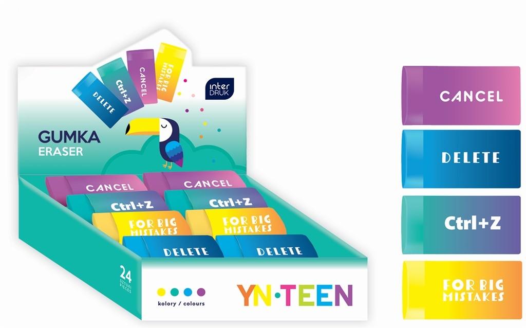 Kolorowa gumka o poręcznym, owalnym kształcie i młodzieżowych hasłach na owijce. Doskonale ściera, nie pozostawiając smug. Wygodna do przechowywania w każdym piórniku. Dostępna w 4 kolorach: fioletowym, niebieskim, turkusowym i żółtym. 24 szt. w displayu.