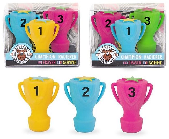 XTREME gumka Champions zestaw 3 sztuk. Dla prawdziwych mistrzów - gumka i trofeum w jednym. Ten zestaw jest idealny, aby rozjaśnić codzienne życie wszystkich kochających sport zwycięzców. To także świetny pomysł na prezent! Dostępne w dwóch zestawach kolorystycznych: żółto-niebiesko-różowy, niebiesko-różowo-zielony Rozmiar: ok. 3,6 x 2,8 cm