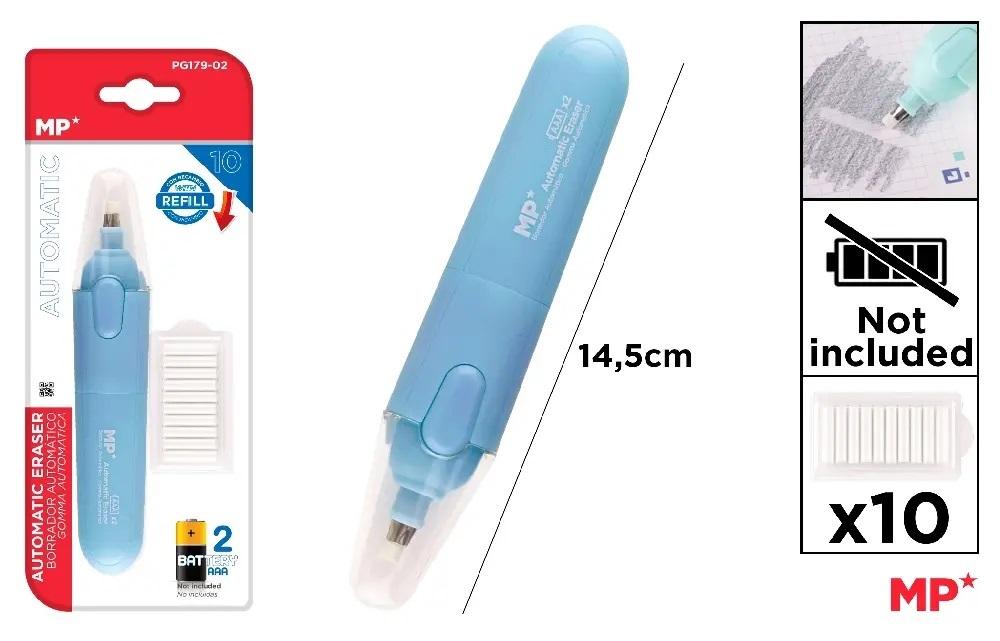 Plastikowy, gumowy uchwyt z przyciskiem do stopniowego wysuwania gumki. Zawiera 12 białych patyczków gumki. Guma nietoksyczna. Działa na 2 baterie AAA (brak w zestawie). Blister 1 niebieskiej sztuki.