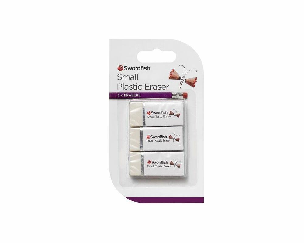 Trzy małe gumki marki Swordfish, z tworzywa sztucznego, każda zapakowana w osłonke chroniącą przed zabrudzeniem. Gumka jest nietoksyczna oraz bez lateksu (non toxic & latex free).