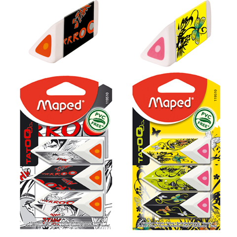 Trzykolorowa ergonomiczna gumka PYRAMIDE o przekroju trójkąta, pakowana tekturową ruchomą osłonkę. 3 rodzaje wzorów - Paris Fashion i Comics, Punk Rock. Produkt ekologiczny - nie zawiera PVC i ftalanów. 3 gumki na blistrze. Wzór wysyłany losowo.