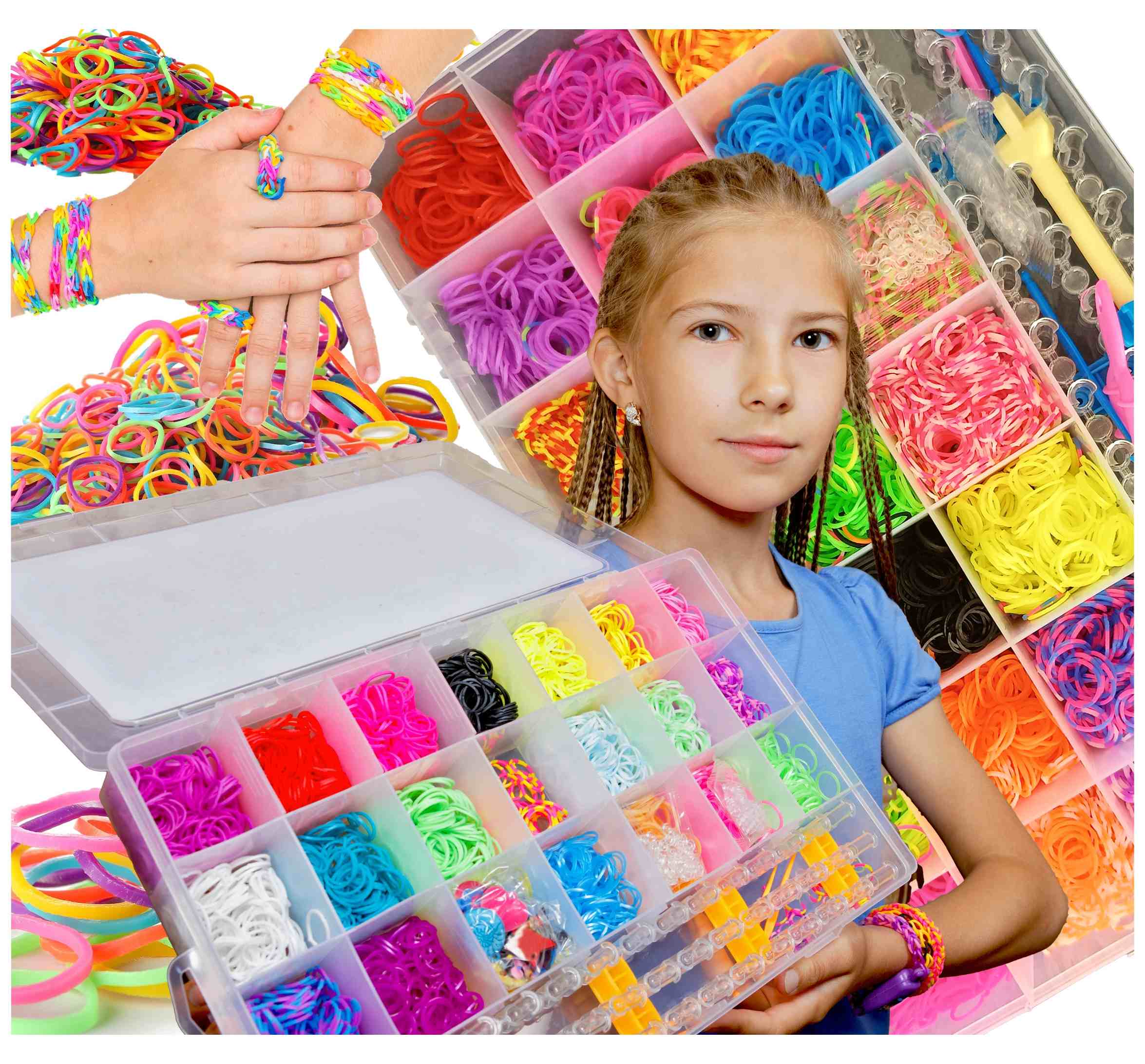 Duży zestaw do tworzenia bransoletek marki Happy Kiddo zawiera ponad 6600 elementów, w tym kolorowe gumki, krosno, szydełka i klipsy S, umożliwiając dzieciom od 8. roku życia rozwijanie zdolności manualnych i kreatywności.
