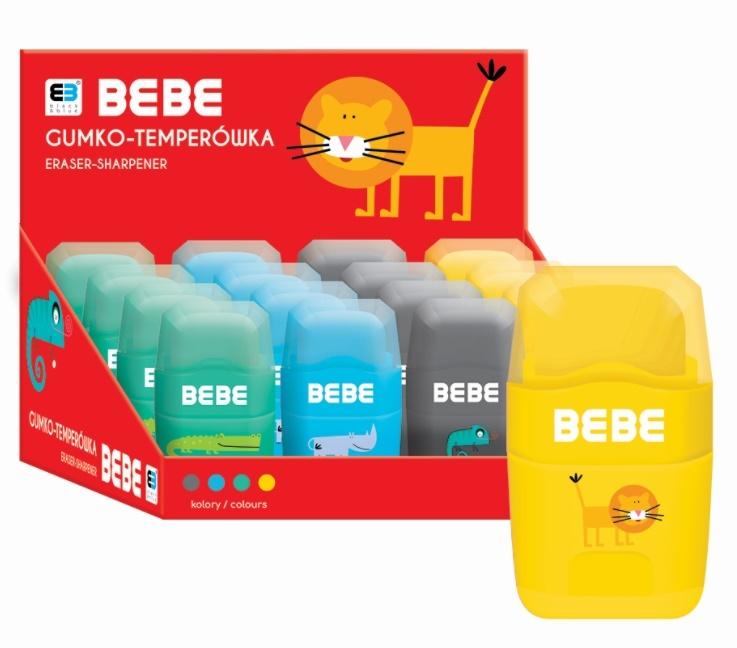 Gumka i temperówka w jednym. Miłe w dotyku, matowe wykończenie. Temperówka z podwójnym, stalowym ostrzem dla 2 grubości kredek umożliwia zaostrzenie ołówków i kredek o standardowej, jak i większej średnicy. Wyposażona w wygodne, zamykane wieko i pojemnik na ścinki, który umożliwia bezproblemowe naostrzenie, kiedy w pobliżu nie ma śmietnika. Dostępna w 4 intensywnych kolorach z podobiznami zwierzaków z serii BEBE. 16 szt. w displayu.