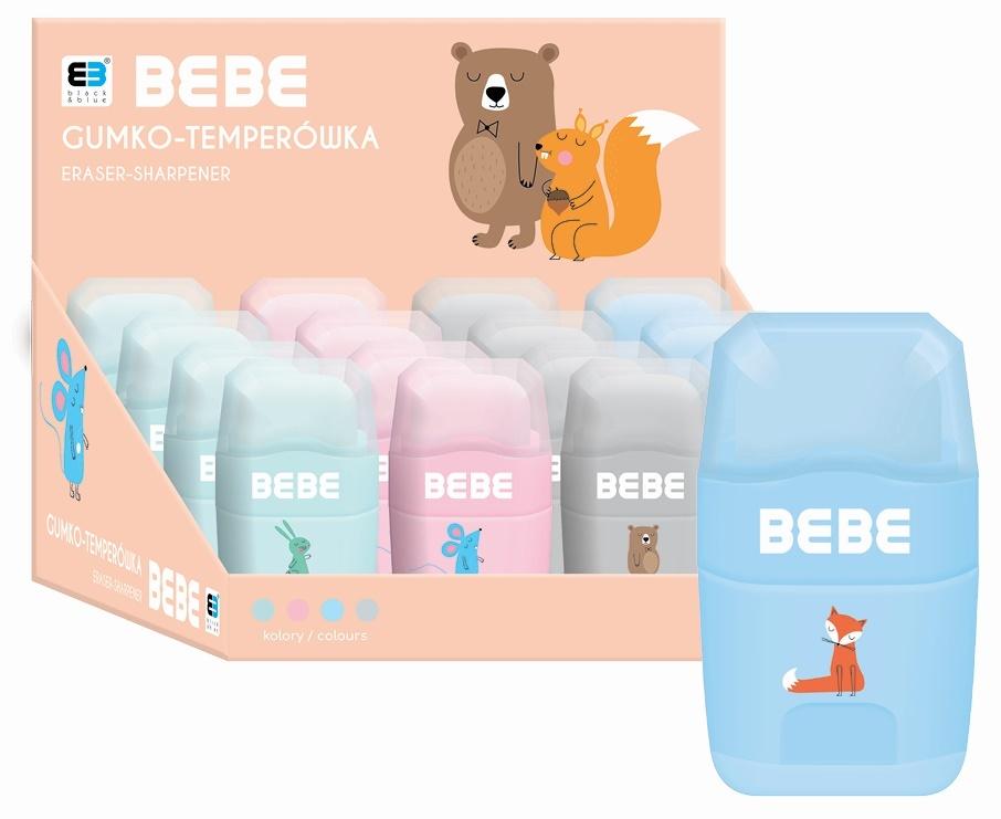 Gumka i temperówka w jednym. Miłe w dotyku, matowe wykończenie. Temperówka z podwójnym, stalowym ostrzem dla 2 grubości kredek umożliwia zaostrzenie ołówków i kredek o standardowej, jak i większej średnicy. Wyposażona w wygodne, zamykane wieko i pojemnik na ścinki, który umożliwia bezproblemowe naostrzenie, kiedy w pobliżu nie ma śmietnika. Dostępna w 4 pastelowych kolorach z podobiznami zwierzaków z serii BEBE.